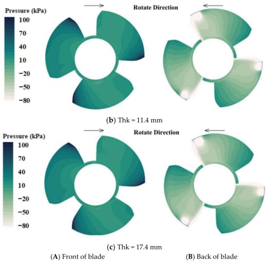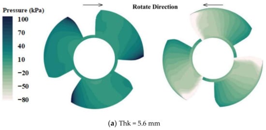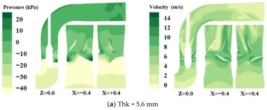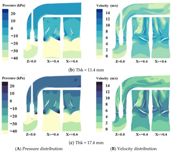 Cross-sectional velocity and pressure distribution of axial flow pump with different thickness.