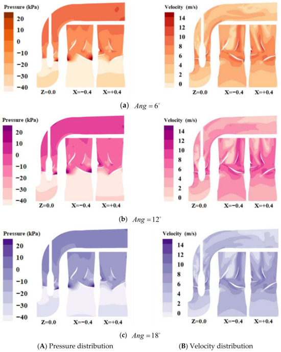 Cross-section velocity and pressure distribution of axial flow pump at different cutting angles.