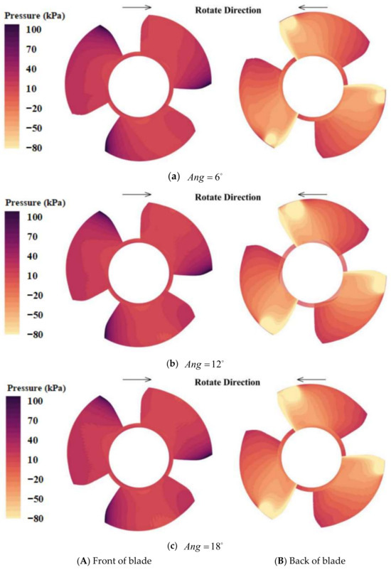 As shown in Figure 12, the main difference in the pressure distribution before and after the runner blade is the flatness of the isoline of the runner working face, and the isoline inflection point of the runner pressure distribution after cutting is close to 120°. On the suction surface of the blade, the area where the negative pressure of the suction surface of the blade with a cutting angle of 12° is less than −80 kPa is slightly larger than that of the other two schemes. The hydraulic loss of the impeller with a cutting angle of 12° decreases, the hydraulic loss of the guide vane increases, and the overall working efficiency obviously decreases. The work capacity of the blade with a cutting angle of 12° becomes stronger, which reduces the hydraulic loss of the impeller, but because the structure of the guide vane remains unchanged, the hydraulic loss of the guide vane region increases, and the overall working efficiency still decreases.
