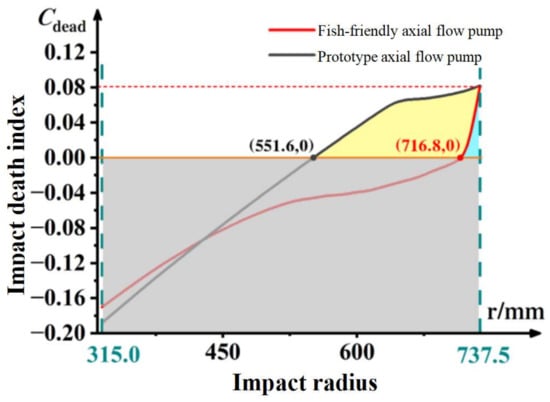 The optimized axial flow pump runner was close to the runner without damage. The calculation and verification of the original data points before fitting showed that when the radius of the impact point was 723.43 mm, the impact velocity was 4.807 m·s−1 and the death index was less than 0.0015. When the radius was less than 716.8 mm, the impact velocity was less than 4.8 m·s−1. Thus, there is no need to discuss the specific value of the blade impact probability as the fish would not be killed by hitting the leading edge of the blade. The impact death rate can be obtained by the integral of the impact death index for the radius r. Therefore, the yellow and blue shadow area in the figure can be used to roughly estimate the total impact mortality ratio of the axial flow pump runner before and after optimization, and the ratio before and after optimization was close to 7:1.