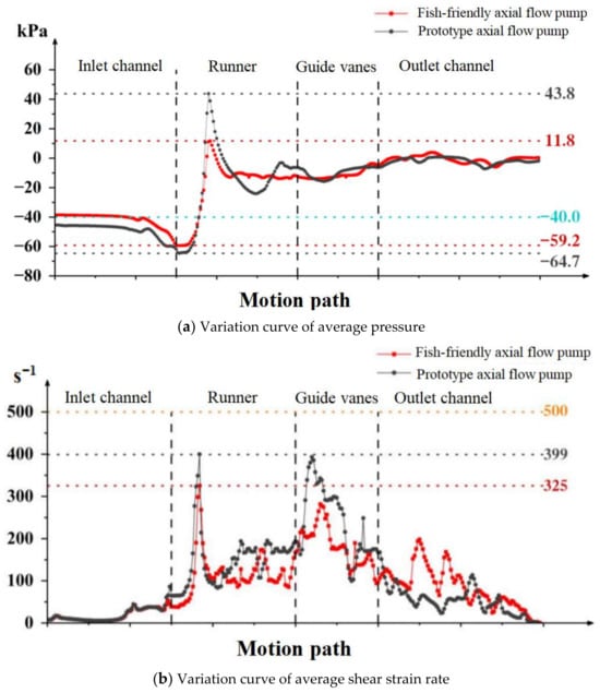 From the point of view of the variation in the average pressure of the fish body with the motion path in Figure 16, the lowest negative pressure in the inlet section of the fish-friendly axial flow pump was higher than −40 kPa when the runner pressure was −59.2 kPa. The inlet passage of the prototype pump was at a pressure lower than −40 kPa, and the lowest negative pressure was −64.7 kPa. The average and maximum negative pressures of the fish friend pump were higher than those of the prototype pump. The maximum positive pressure on the front of the blade on the path of the fish was 11.8 kPa, which was significantly lower than that of the prototype axial flow pump at 43.8 kPa. This showed that the level of pressure gradient caused by the pressure change in the fish body in the fish-friendly pump was lower, so it was less vulnerable to pressure gradient damage. This means that the degree of negative pressure damage to the passing fish body was reduced, and it was more beneficial for the fish to pass through the axial flow pump.