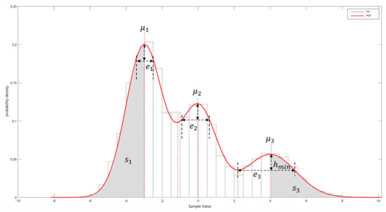 As illustrated in Figure 3, the abscissa of the maximum point of each bell–shaped curve, denoted as , , and , and the abscissa of the minimum points and , are acquired from the PDF curve. In this scenario, where equals 3 and equals , the sample widths are , , and , respectively. Notably, is equivalent to which is 3 in this case. The weights for each Gaussian distribution, , are determined as , where k spans from 1 to 3. Subsequently, the variances of the Gaussian components, , , and , are calculated using and .