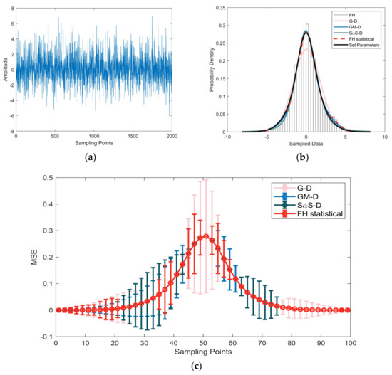 Waveform plot, probability density function (PDF) curve, and mean square error of non–Gaussian random sequences. (a) Waveform plot; (b) comparative PDF curves based on different models in graphical format; and (c) mean square error plots of the fitting results from different models.