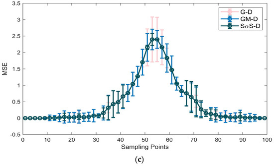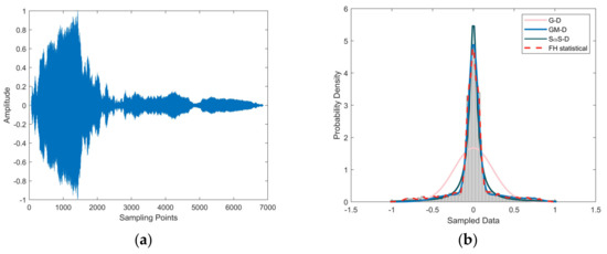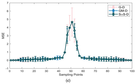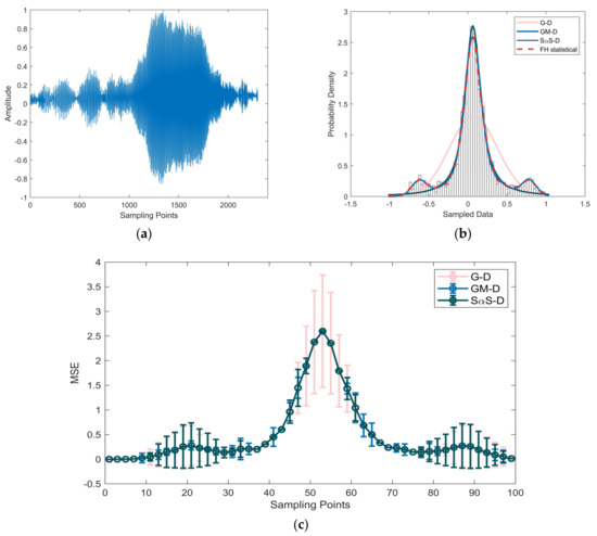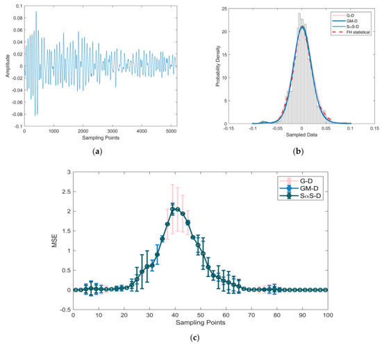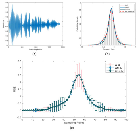 Figure 7a displays the waveform of the measured reverberation data in Experiment 1, while Figure 8a, Figure 9 and Figure 10a showcase the waveforms of three distinct segments of Experiment 2’s measured reverberation data. In Figure 7b, Figure 8, Figure 9 and Figure 10a,b, PDF curves fitted by various models are presented. Figure 7c, Figure 8, Figure 9 and Figure 10a–c depict comparative mean square error plots for the fitted PDF results using various models. The gray bars within the figures represent the frequency histogram of the reverberation data, with the red dashed line depicting the PDF curve derived statistically from the frequency histogram, thus representing the true model values. The PDF curve for the Gaussian distribution is depicted by a pink curve labeled as G–D in the figures. The PDF curve fitted by the GMM is represented in sky blue and marked as GM–D in the figures, while the dark blue curve corresponds to the PDF of the SαS distribution and is denoted as SαS–D in the figures.