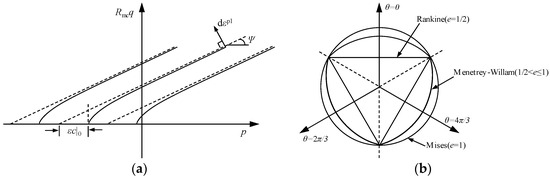 In Equation (2), ε represents the meridian eccentricity, which governs the resemblance between the hyperbolic shape of the plastic potential function on the meridian plane and its asymptote. The dilatancy angle, denoted by ψ, and the initial cohesion c|0 are also defined. The value of c|0 signifies the cohesion prior to any plastic deformation, and in the absence of hardening or softening, it remains constant. The triple symmetric elliptic form of the plastic potential function on the partial plane is denoted by Rmw(θ, e) and can be expressed using Equations (3) and (4).
