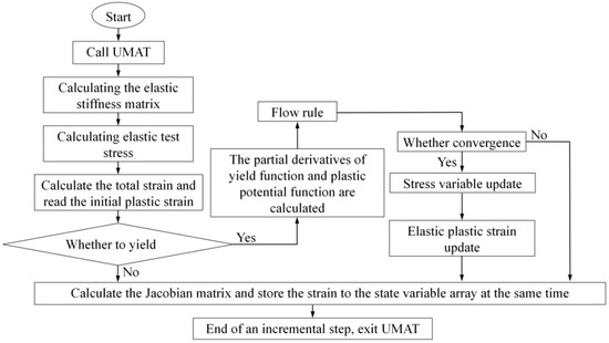 The object of the UMAT subroutine during data transmission is the integral point of the unit. At the beginning of the incremental step, the main program will enter the UMAT through the UMAT interface and pass the initial value of the important variable to the unit integral point. At the end of the UMAT call, the updated variables will return to the main program through the interface, and the complete call process of the user material subroutine UMAT is shown in Figure 3.