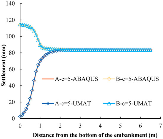 To evaluate the computational accuracy of the UMAT implementation, a comparative analysis was conducted with results obtained from the ABAQUS source programs. The analysis involved using a cohesion value of 5 kPa and a friction angle of 30°. Figure 5 depicts the embankment settlement curve determined by both the ABAQUS source program and UMAT. The settlement obtained from the ABAQUS source program measures 114.7 mm, while the UMAT implementation yields a settlement of 114.3 mm. This indicates a negligible maximum error of 1%. In addition, the calculation results of both the source program and UMAT at the top of the embankment are consistent, both of which are 83.7 mm. By comparing the calculation results of the ABAQUS source program and UMAT, it can be seen that the UMAT subroutine written in this paper is in good agreement with the calculation results of the source program, and the calculation accuracy is high. Therefore, it is feasible to develop an anisotropic yield criterion based on the current UMAT.