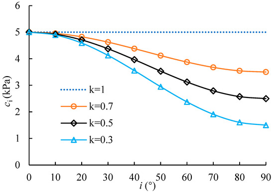 To analyze the influence of the anisotropy degree of cohesion on the stress distribution and settlement of embankments, we selected a cohesion value of cv = 5 kPa and defined different anisotropy coefficients to quantify the degree of anisotropy. The friction angle was assumed to be isotropic at 30°. Based on the analysis results from Reference [53], we considered anisotropic coefficients of cohesion as 0.7, 0.5, and 0.3. The ci values under different anisotropic coefficients k of cohesive force were calculated using Equation (23). Figure 6 illustrates the variation of ci with the direction angle i of the major principal stress. When i = 0°, ci reaches its maximum value cv; when i = 90°, ci takes the minimum value ch. For values of i between 0° and 90°, ci shows a nonlinear decreasing trend. Please refer to Table 3 for the model plan of the study on anisotropic cohesion.