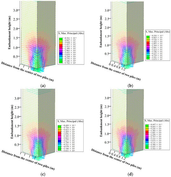 In order to study the influence of cohesion anisotropy on the stress distribution in embankments, the distribution of major principal stress and the change of pile–soil stress ratio under different degrees of cohesion anisotropy are analyzed, respectively. Figure 7 shows the vector diagram of the major principal stress of the embankment with different anisotropy coefficients k. It can be seen from the figure that the direction of the major principal stress at the center of the two piles is close to the horizontal direction in the range of 0–1.5 m. At the same height in the embankment, from the center of the two piles to the upper position of the pile top, the major principal stress gradually deflects from the horizontal direction to the vertical direction and points to the pile top. As the anisotropy coefficient decreases, the major principal stress above the pile top decreases, indicating that the anisotropy leads to a decrease in strength, which weakens the horizontal transmission effect of vertical stress. This is consistent with Wang and Jin’s [53] proposal that ‘with the application of gravity load, the major principal stress gradually turns to the vertical direction’.
