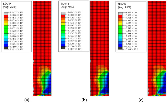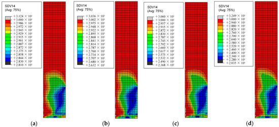 In the UMAT subroutine, the cohesive force is stored by the fourteenth state variable (SDV14). Figure 8 shows the anisotropic cohesive force distribution when the embankment model calculation is completed. It can be seen from the figure that the cohesion changes with the direction of the major principal stress. The closer to the center of the two piles, the smaller the cohesion, indicating that the vertical stress at this position is no longer the major principal stress, and the direction of the major principal stress tends to be horizontal.