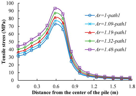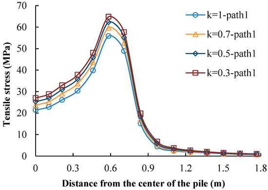 Geogrid is an important part of effectively distributing the internal stress of embankment structures in geotechnical engineering. In order to study the influence of cohesion anisotropy on the mechanical properties of geogrid, it is necessary to analyze its tensile stress behavior. Figure 11 shows the tensile stress curve of geogrid along path 1. It can be seen from the diagram that the main growth of tensile stress along path 1 occurs in the area corresponding to the pile cap, and the peak stress appears at the edge of the pile cap. This has a good correspondence with the research results of Jones [55] and Halvordson [56]. It is mainly due to the formation of a rigid support point at the connection between the geogrid and the pile at the edge of the pile cap. Near this support point, the load will be transmitted to the pile body through the geogrid, leading to an increase in stress. As the anisotropy coefficient k decreases from 1 to 0.3, the maximum tensile stress along path 1 increases significantly by 15.5%, from 56.1 MPa to 64.8 MPa. Therefore, in the design and application of geogrids, it is necessary to fully consider the anisotropy of soil cohesion. The mechanical properties of the soil are fully investigated and tested to ensure that the mechanical properties of the geogrid meet the engineering requirements.