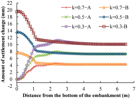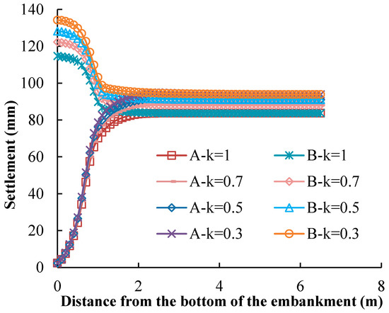 Influence of the anisotropic coefficient k on the settlement variation of the embankment.
