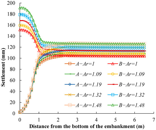 Figure 12 shows the influence of different degrees of anisotropy of cohesion on the vertical settlement of the embankment. A represents the position of the pile top, and B represents the center position of four piles. It can be seen that the stronger the anisotropy of cohesion, the larger the settlement of the embankment. The minimum settlement of the embankment is the contact position between the bottom of the embankment and the pile cap, and the maximum settlement is the center position of the four piles at the bottom of the embankment. It can be seen from the figure that the settlement value is consistent within a certain height to the top surface of the embankment. From the same level to the top of the pile, the settlement gradually decreases. From the same level to the center of the four piles at the bottom of the embankment, the settlement gradually increases. When the anisotropy coefficient is different, the position of the equal settlement surface is about 2.3 m, so the change of cohesion caused by the anisotropy coefficient has little effect on the position of the equal settlement surface. The variation in settlement with changes in the anisotropy coefficient is shown in Figure 13. Combined with Figure 12, it can be seen that when the anisotropy coefficient decreases from 1 to 0.3, the maximum settlement increases from 114.7 mm to 134.2 mm, an increase of 17.0%. The settlement of the top surface of the embankment increases from 83.7 mm to 93.8 mm, an increase of 12.1%, indicating that the anisotropy of the cohesive force has a significant impact on the settlement of the embankment.
