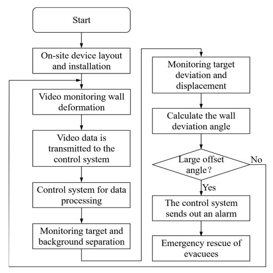 Typically, when designing retaining walls, deformation limits are established in alignment with engineering requirements and relevant standards. One common criterion pertains to the maximum inclination of the retaining wall surface, often falling within the range of 1% to 2%. Consequently, this paper adopts 2% as the threshold for the ultimate deformation standard of the retaining wall. To account for this standard, multiple video monitoring areas are defined. If the retaining wall exceeds a tilt angle of αj > 2%, indicating an excessive wall angle, and when more than 50% of the wall monitoring system detects that the retaining wall exceeds the 2% limit, the control system will activate an alarm. This alarm will trigger the evacuation of personnel and initiate emergency rescue procedures.