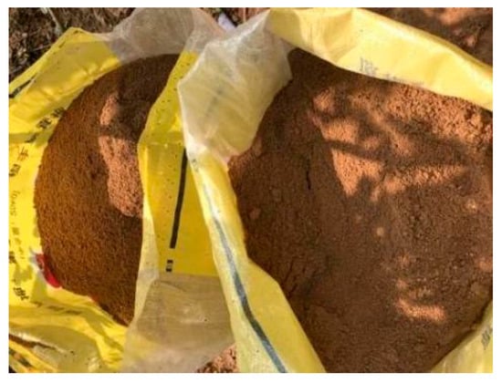 The loess utilised in this experimental study was sourced from Chang’an County in Xi’an City. This loess belongs to the typical fourth-quarter Late Pleistocene loess category, characterised by its yellow-brown colour, uniform soil texture, sporadic calcareous streaks, the presence of plant roots, and a firm soil structure. To maintain consistency in the greening specimens for each group during the testing, the soil samples were meticulously collected on-site in strict adherence to the sampling location, stratum, and depth criteria. All soil samples were procured from a depth of 1 m to 2 m below the ground surface. After extraction, the soil samples underwent a sieving process to remove large impurities. They were then promptly sealed, placed in plastic bags, and appropriately labelled. This process is illustrated in Figure 5.