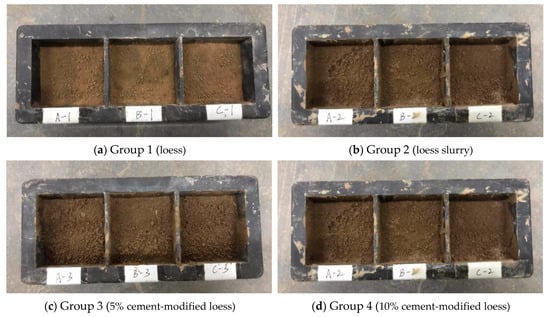 For the preparation of the cement-modified loess slurry, air-dried soil samples were utilised. These disturbed soil samples were crushed into fine particles and then naturally air-dried. Following air-drying, the fine loess particles were passed through a 2 mm sieve. The moisture content of the naturally air-dried soil samples was determined to be 2.01%. The cement employed in the experiment originated from the same batch of 32.5R silicate cement produced by Shaanxi Yaoxian Cement Factory, with a production date not exceeding three months.