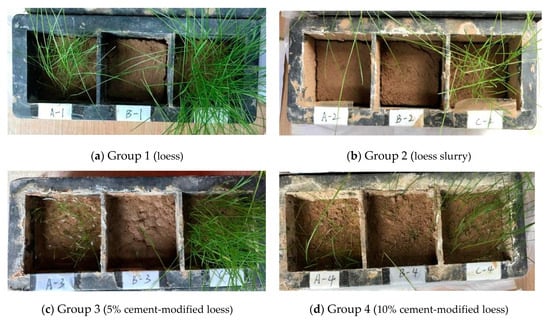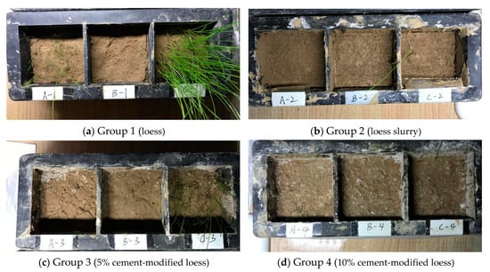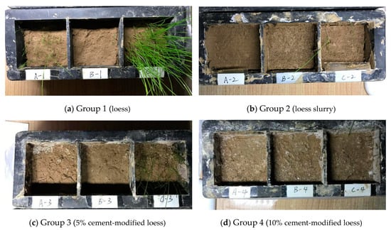 In accordance with the “Geotechnical Test Method Standard” (GB/T50123-1999), the process involved retrieving disturbed soil samples and crushing them into fine particles. The fine loess particles were air-dried and then passed through a 2 mm sieve to obtain soil powder. Different cement mixing ratios were used to create the cement-modified loess. The mixed material was placed in 10 cm × 10 cm × 10 cm moulds. To ensure proper seed germination, the seeds were not buried too deeply; they were mixed with a specific amount of grass seed in the top third of the sample height. Given that the seeds might be partially exposed on the specimen’s surface after mixing, which could hinder growth and germination, a 1~2 mm layer of loess was evenly sprinkled on the surface of each specimen, as depicted in Figure 7.