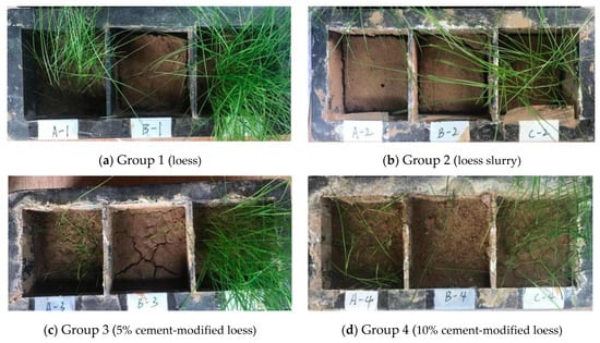 - Planting substrate No. 2 showed poor growth and germination for all three types of grass seeds compared to the other substrates. The reason is that planting substrate No. 2 is essentially a soil slurry. Due to the small particle size of soil particles used in the test and the high water–solid ratio, the soil slurry lacks the necessary air for seed germination, resulting in a low germination rate in later stages. In contrast, the cement-modified loess slurry allows for adequate air supply, as the cement does not completely encase all aggregates (soil particles), leaving gaps between them.