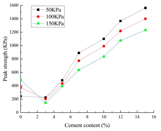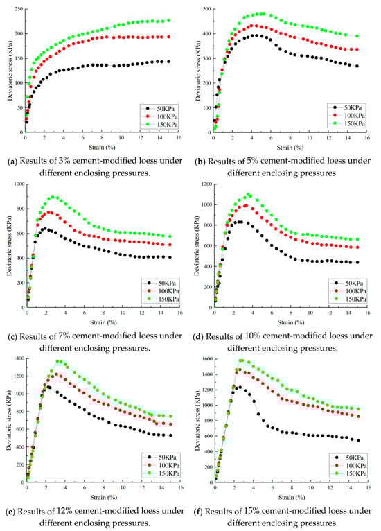 Figure 16 displays the stress–strain curves of cement-modified loess subjected to varying enclosure pressures. The peak strength is not only associated with the cement dosage, but is also dependent on the magnitude of the surrounding pressure. The peak shear strength of the cement-modified loess specimens increases with higher peripheral pressure. Under low peripheral pressure conditions, the specimens exhibit characteristics of strain softening, leading to brittleness. Conversely, under high peripheral pressure, cement-modified loess displays characteristics of an ideal elastic–plastic material, with the rupture surface becoming apparent after reaching the maximum load, accompanied by some slippage.
