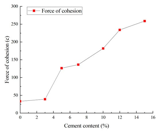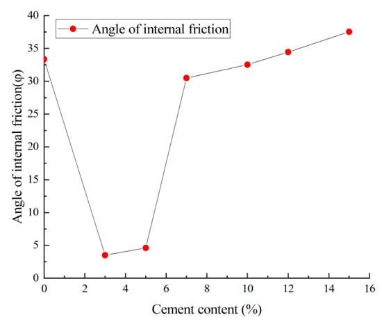 Figure 13 illustrates the impact of different cement admixture ratios on the shear strength of cement-modified loess. When compared to loess without cement, the shear strength and shear strength parameters, denoted as c and φ, exhibit an initial increase followed by a subsequent decrease. This pattern is attributed to the fact that the strength of loess primarily relies on its inherent characteristics and particle structure. Loess is categorised as a semi-plastic soil with minimal cohesion and an internal friction angle. The introduction of cement serves to enhance soil cohesion and elevate shear strength. However, when the cement incorporation ratio is low, the amount of cement added to the loess remains relatively small, limiting its ability to reinforce the loess. Additionally, under these conditions, cement particles within the loess may not be uniformly dispersed and well integrated with the loess particles. Consequently, the strengthening effect of cement may not be pronounced, and the shear strength of the loess remains relatively low. As the cement admixture ratio increases, the hard-setting skeleton formed through cement hydration becomes more effective, enabling higher peak strength to be achieved in cement-modified loess. From Figure 14 and Figure 15, it can be seen that the shear strength parameters c and φ increase with the increase in the cement admixture in cement-modified loess. The cohesive strength c of cement-modified loess increased more when the cement dosing ratio was increased from 3% to 5%. The internal friction angle φ of cement-modified loess increased more when the cement mixing ratio was increased from 5% to 7%. In cases where the cement mixing ratio is less than 5%, insufficient hydration and hydrolysis reactions occur, failing to establish a continuous hardened skeleton. Consequently, the strength of cement-modified loess primarily hinges on the plasticity of the enhanced soil particles, resulting in less-pronounced strength improvement. As a result, when compared to cement-modified loess with a higher cement mixing ratio, cement-modified loess with a lower cement mixing ratio exhibits lower strength after the cement has hardened. Nevertheless, it is essential to consider that, in practical projects, there is a diminishing return on both cost-effectiveness and utilisation when the cement admixture surpasses a certain threshold. Therefore, the optimal cement admixture ratio for cement-modified loess should be determined through appropriate testing.