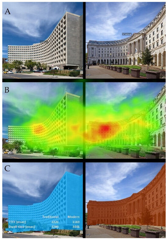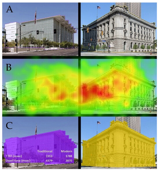 (A) At left, the Martin V. B. Bostetter Jr. U.S. Courthouse in Alexandria, Virginia, paired with a modern counterpart, the U.S. Courthouse, in Newport, Virginia. (B) Heatmaps of both buildings (C) Outlined AOI. The TTFF as shorter for the traditional building and the dwell time longer.