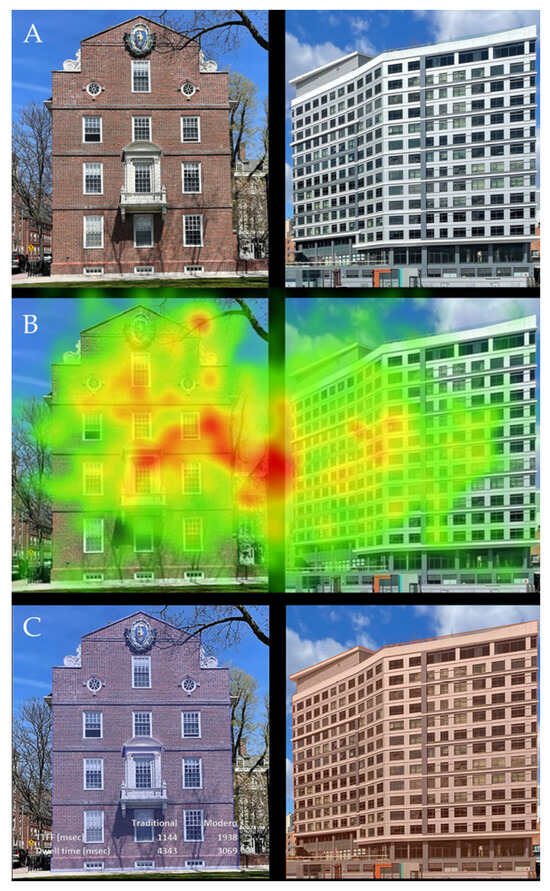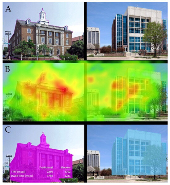 (A) Paired image of Harvard University student dormitory, Cambridge, MA, and a residential building, Boston, MA, at left. (B) Heatmap of this pairing. (C) AOIs. The TTFF was shorter for the traditional dormitory, at left, and the dwell time was longer (photos ©Ann Sussman).