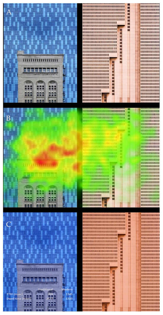 In this study, more images with pairs of modern vs. traditional buildings were tested, and we further explored the importance of fenestration and face-like patterns. Heatmaps focused more on traditional and highly organized facades, than simpler ones. TTFF was influenced by both position and content, while dwell time was higher in images with more organized complexity (Figure 18 and Figure 19).