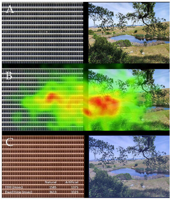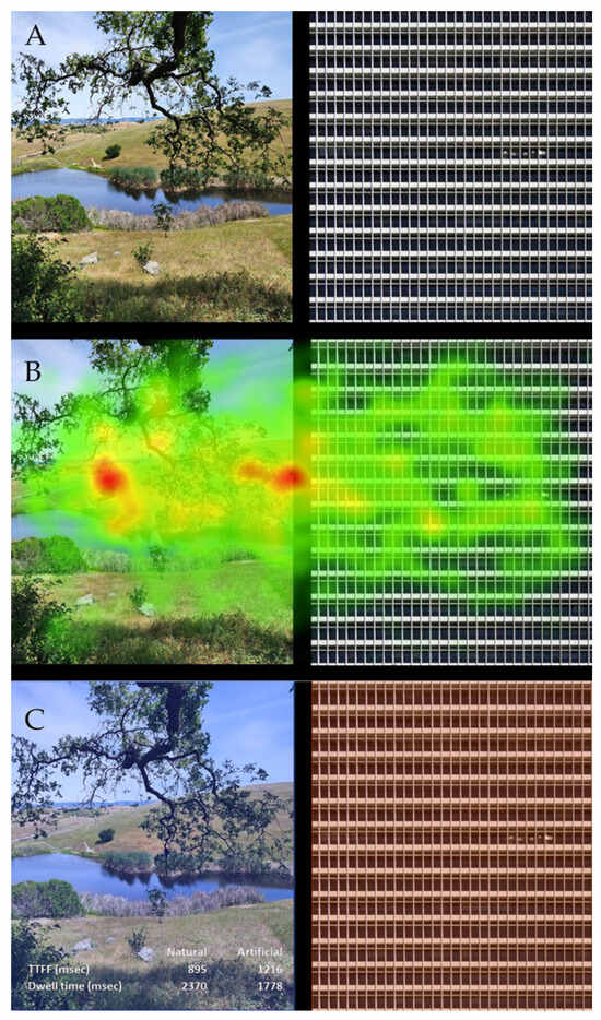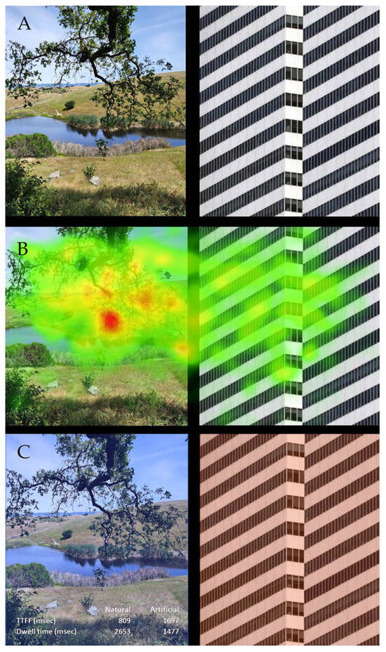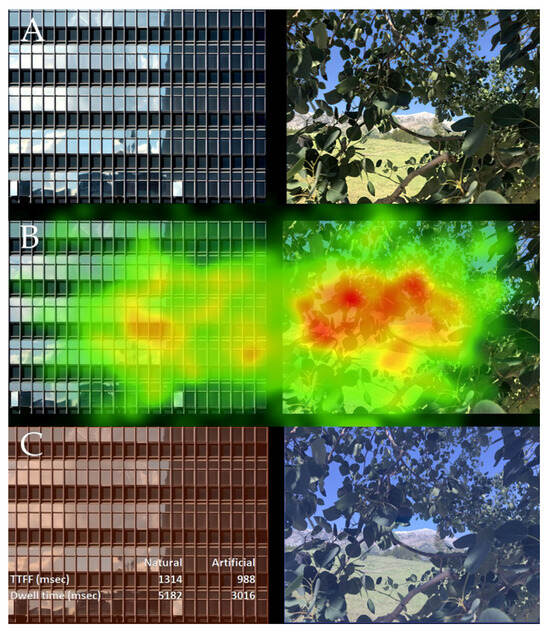 (A) Paired image of a repetitive glass facade in Manchester, England, with a natural setting near Bridger Bowl in Bozeman, Montana, USA, at left. (B) Heatmap of this pairing. (C) AOIs. The TTFF was shorter for the artificial scene, while the dwell time was longer for the natural scene (photos ©Alexandros Lavdas, Abigail Sekely).