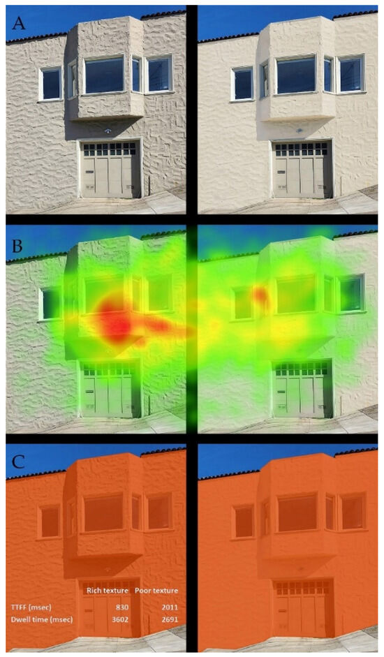 In this study, paired images compared building facades with detail and texture to alternative versions (processed using Adobe Photoshop) showing less detail and texture. More red heatmap areas were found on architectural images with higher levels of detail and texture. Participants avoided blank portions of building elevations (Figure 8, Figure 9, Figure 10 and Figure 11). In AOI, first fixations usually favored textured surfaces over ones with less texture and detail, in this case irrespective of the first or second position. Dwell times also showed substantial increase on detailed surfaces.