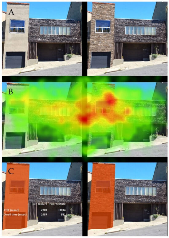 (A) Paired image of residence in Potrero Hill, San Francisco, CA, with a processed version smoothing the surface material, at left. (B) Heatmap of this paired image. (C) AOIs. The TTFF was shorter for the building with texture, and the dwell time was longer (photos ©Hernan Rosas).