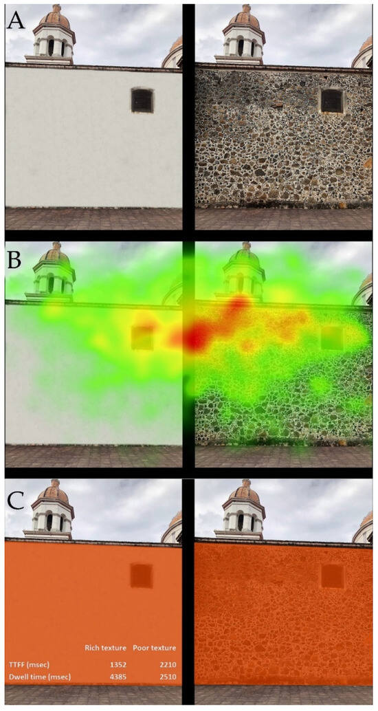 (A) Paired image of a processed blank church wall in Cocula, Jalisco, Mexico, with the original stone wall, at left. (B) Heatmap of this pairing. (C) AOIs. The TTTF was shorter for the original stone wall, and the dwell time was longer (photos ©Hernan Rosas).