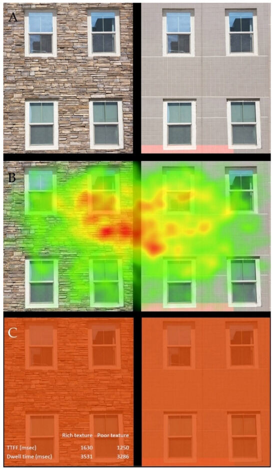 (A) Paired image of a stone townhouse wall in Communications Hill, San Jose, CA, with a blank processed facade, at left. (B) Heatmap of this pairing. (C) AOIs. The TTFF was shorter for the building wall with less texture, but the dwell time was longer for the textured surface (photos ©Hernan Rosas).