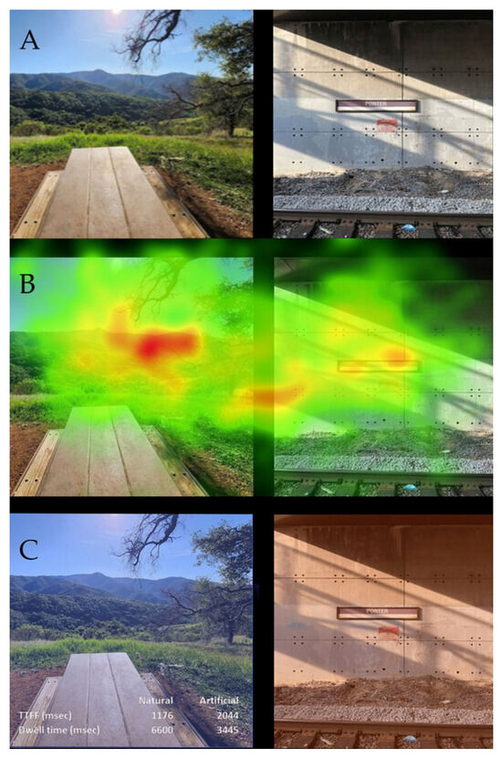 (A) Paired image of Bull Run Picnic Area, San Jose, CA and Porter Square transit station in Cambridge, MA, at left. (B) Heatmap of this pairing. (C) AOIs. The TTFF was shorter for the natural scene, and the dwell time was longer (photos ©Hernan Rosas, Ann Sussman).