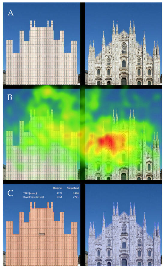 (A) Paired image of a processed version of the Milan Cathedral, where all details have been replaced by a photo of curtain wall face adjusted for color and the original building in Milan, Italy [5]. (B) Heatmap of this pairing. (C) AOIs. The TTFF was shorter for the original image of the Milan Cathedral, and the dwell time was longer (photos Alexandros Lavdas).
