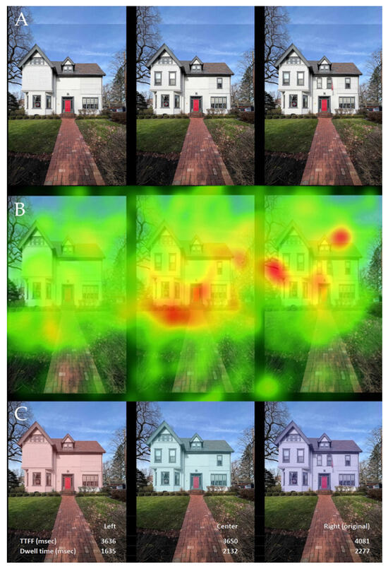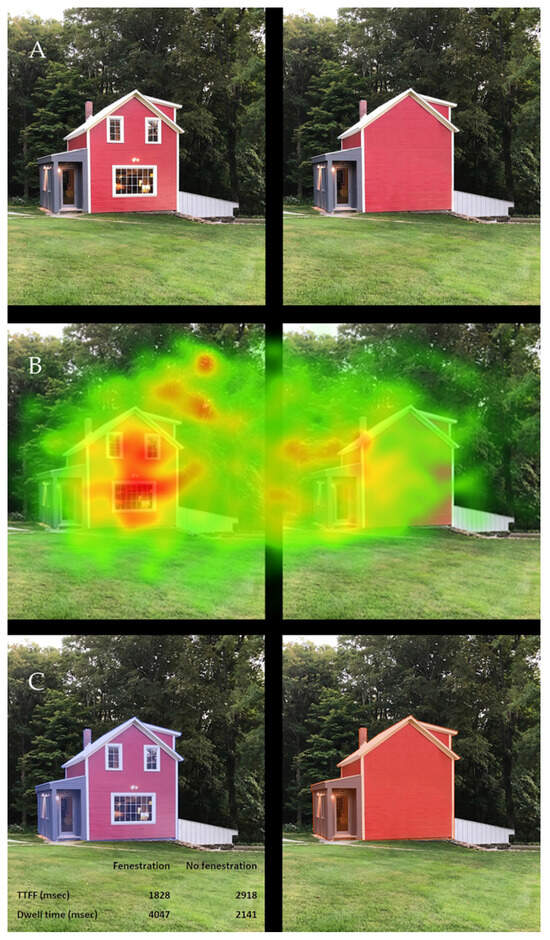 (A) Images of a residence in Bethlehem, PA, and two processed versions with fewer windows. (B) Heatmap of this trio. (C) AOIs. The TTFF was shorter for the house at far left, followed immediately by the one in the center; dwell time was longer for the original image on the right, becoming progressively shorter as openings are removed in the center and, even more, on the left (photos ©Abigail Sekely).
