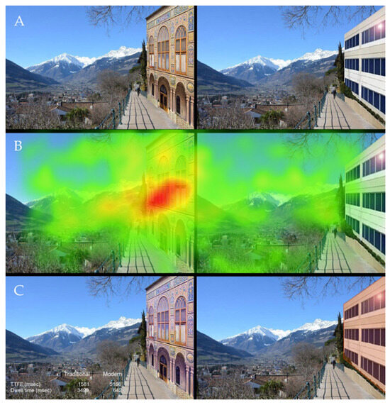 (A) An Alpine landscape in Meran, South Tyrol, Italy, with two added buildings: either a building from the Golestan Palace complex in Tehran, Iran, or a public domain image of modern office building [27]. (B) Heatmap of this pairing. (C) AOIs (photos ©Alexandros Lavdas). The TTFF was shorter for the traditional elevation over the adjacent one showing an elevation with repetitive parallel lines; the dwell time was much longer for the traditional one.