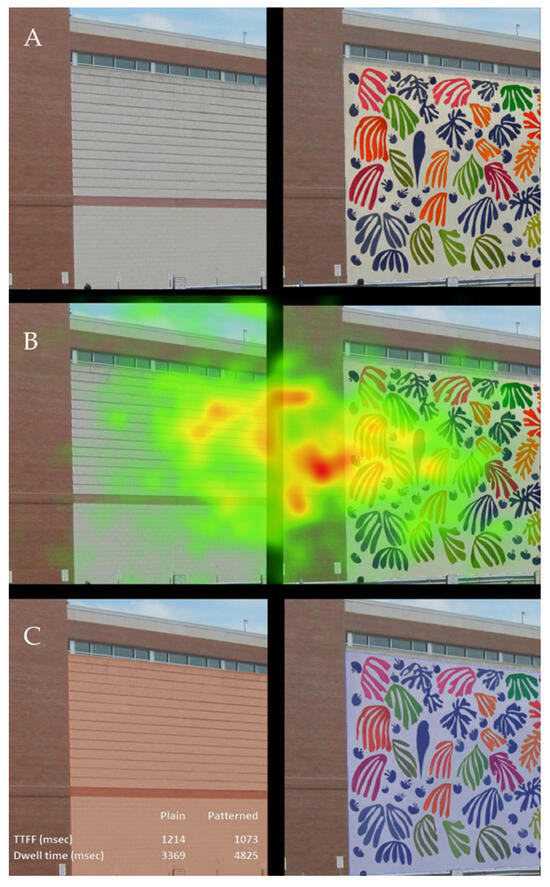 (A) Paired image of parking garage wall in Somerville, MA, and a processed version with patterns. (B) Heatmap of this pair. (C) AOIs. The TTFF was shorter for the blank wall over the patterned one; the dwell time however was longer for the latter (photos ©Ann Sussman, Janice Ward).