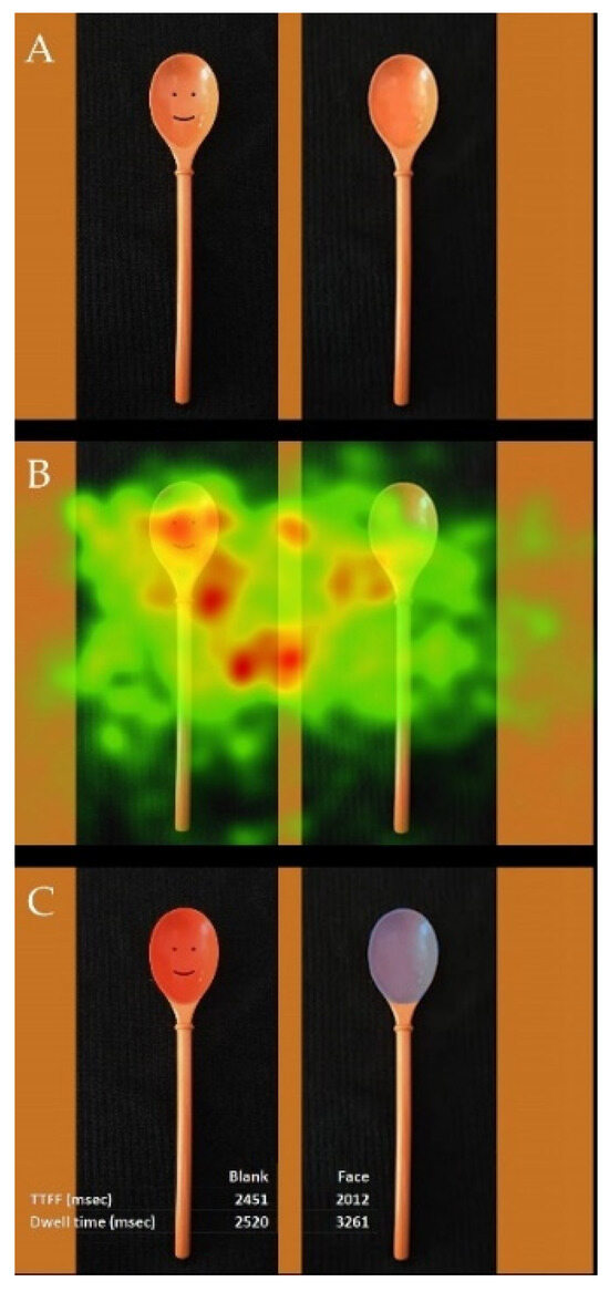 (A) Paired image of a spoon with rudimentary face-like cut-outs, and a processed version without them. (B) Heatmap of the pair. (C) AOIs.The TTFF was shorter for the spoon with a face over the blank one without, and the dwell time was longer for it (photos ©Ann Sussman).
