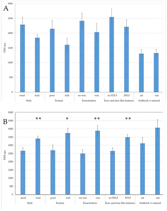 TTFF was generally shorter for images with organized complexity (traditional, increased texture, presence of fenestration, and presence of eyes and face-like features) and similar between artificial and natural structures images. However, in t-tests, in none of these cases did the p values of the two-tailed test reach 0.05 or lower. More specifically, it was 0.145 for Style, 0.158 for Texture, 0.336 for Fenestration, 0.382 for Eyes- and face-like features, and 0.906 for Natural vs. Artificial.