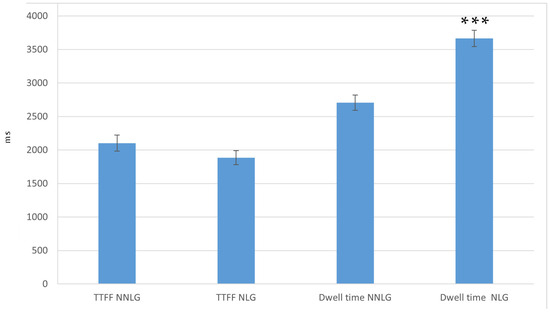 The same results are presented in Supplementary Figure S7 (TTFF) and Supplementary Figure S8 (dwell time), but this time with data segregated according to the placement of the photographs in the pair (left-right). There is a positional bias in some cases, with the first position conferring an advantage, with shorter TTFF and longer dwell time, but always with the same pattern as seen in the cumulative results. Finally, based on the premise on which this study was conceptualized, that is, that there are some geometries that are “nature-like” and some that are not, we added together the data from all the pairs of results from the 5 categories into one large data pair, containing data from images with “Nature-Like Geometry” (NLG) and those with “Non-Nature-Like Geometry” (NNLG). The first group contained all data from images of traditional buildings, rich textures, presence of fenestration, presence of eyes-and face-like features, and nature, while the NNLG category contained all data from modern buildings, poor textures, absence of fenestration, absence of eyes-and face-like features, and artificial structures. The results were the same as when individual categories were examined separately. TTFF was shorter for NLG, but again with p > 0.05 (p = 0.17), while dwell time was longer in NLG, with a very high significance (p = 7.8 × 10−8, Figure 24).