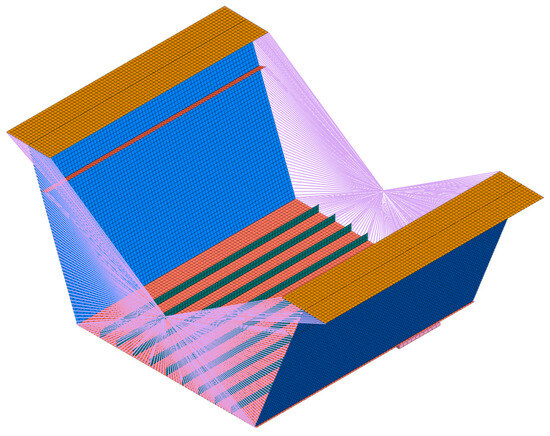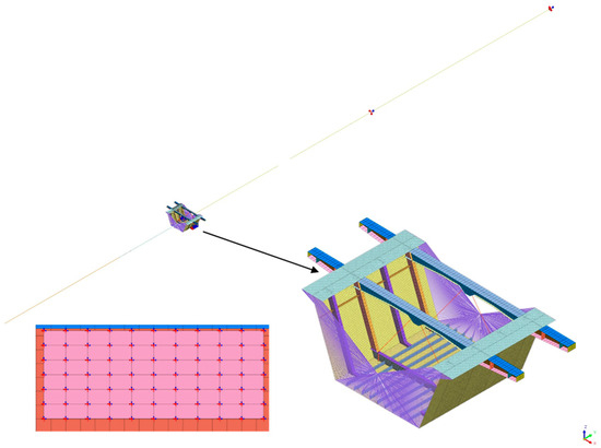 In this paper, the Midas FEA NX finite element analysis software is used to establish a local “beam-shell-solid-contact” finite element model of the steel channel beam under the maximum cantilever condition. The maximum cantilever condition is when the guide beam is about to reach pier 142 and the cantilever length reaches 100 m. The shell unit is selected to model the 8 m long girder section supported by the cantilever root on pier 143 in detail, and the geometric model is shown in Figure 3. The remaining main girders, guide girders, and hollow web truss-type diaphragm are selected to be modeled with beam units, and rigid connections are established in the part where the beam unit meets the shell unit to make their nodes coupled. The rigid connection is shown in Figure 4. Solid units are selected for modeling the pads. The material of the main girder and steel guide beam is Q345qD steel with a density of 7850 kg/m3, a modulus of elasticity of 210 GPa, Poisson’s ratio of 0.3, and the pads are made of rubber pads with a modulus of elasticity of 30 MPa. The overall mesh size of the main beam is 100 mm. The whole beam is divided into 24,379 cells.