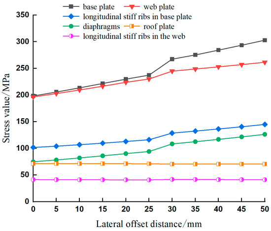When no lateral offset occurs, the pads are positioned on both sides of the beam axis, symmetrical about the axis. When lateral offset occurs, the contact position will be shifted from side to side. The lateral offset of the beam in incremental launching is simulated by changing the relative position of the pads and the base plate of the steel box girders, and the changes in the local stresses of the main components at lateral offsets of 10 mm, 20 mm, 30 mm, 40 mm, and 50 mm are analyzed, respectively, and the results are shown in Figure 11.