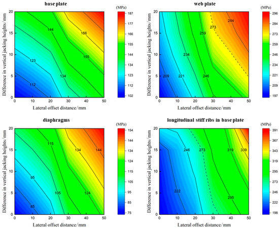 According to Wang Biao’s research [31], the probability of the normal operation of jacking equipment in incremental launching construction obeys a normal distribution; as a result, it is highly likely that two unfavorable states, unsynchronized vertical jacking and lateral offset, will occur simultaneously. If the influence of only a single factor is considered, it is easy to set the safety control thresholds to a large extent, which is not conducive to structural safety. To address this problem, based on the above single-parameter-influenced model of steel box girders, a correlation study of two parameters (unsynchronized vertical jacking and lateral offset) for the control of jacking synchronization is carried out. While changing the relative position of the pads to the base of the beam, a forced displacement in the Z-direction is applied to the base of pad on one side to simulate the simultaneous occurrence of the two unfavorable states. The results obtained from the analysis of the variation in the stresses of each main stress member with the vertical jacking height difference and lateral offset distance are shown in Figure 12.