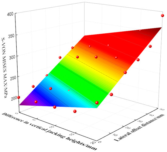 In order to calculate the two-parameter control threshold, a nonlinear surface is fitted to the maximum equivalent stress value of the beam under the influence of the two parameters. For ease of computation, is chosen as the fitted equation, where represents the vertical jacking height difference and the lateral offset distance. The fitting results are shown in Figure 13. Solve for = 182.71, = 2.97, = 2.50. Then, the nonlinear surface fitting equation is: