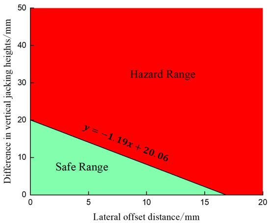 At this point, the structure is in a safe state and the image of the function is plotted, as shown in Figure 14. The green area in the figure shows the safety range under the two-parameter control of the synchronization of incremental launching construction, and the intersections of the function with the coordinate axes are (16.86, 0), (0, 20.06). In practice, the vertical jacking height difference value can be read directly from the vertical jack controller, while the lateral offset value needs to be further measured manually. Therefore, the vertical jacking height difference control thresholds can be set to 15 mm. After the vertical jacking height difference is read, it is substituted into (2) for calculation to determine the lateral offset control thresholds. For example, when the vertical jacking height difference is 10 mm, the calculated lateral offset value should be less than or equal to 8 mm, so as to realize the dynamic control of lateral offset.
