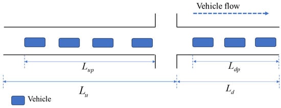 A comprehensive analysis of the travel time and the travel time under free-flow speed can be used to determine the traffic operating status, as shown in the first part of Equation (1), which judges the traffic operating status from the time dimension, or in a macroscopic sense. In urban road conditions, the interactions between vehicles, such as vehicle–vehicle spacing parameters and traffic control, are important factors leading to changes in traffic flow status. As shown in Figure 1, vehicles are distributed within the lanes upstream and downstream of the intersection. Therefore, a comprehensive analysis of vehicle queue lengths and travel time parameters can be used to evaluate the road traffic operating status.