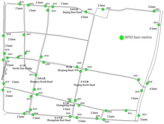 In this paper, we extract the vehicle traffic data recorded by RFID on Nanjing urban roads in December 2015. The distribution of the collected base stations is indicated by the green circles in Figure 3. Due to issues such as information transmission and database storage abnormalities, some abnormal data were collected by some base stations. Therefore, in the data analysis section, only valid vehicle passage data from the collected base stations were selected. Taking the data from December 2nd as an example, the license plate matching method was used to extract the vehicle passage records for each base station and generate data sets of vehicle speeds, headways, and travel times.