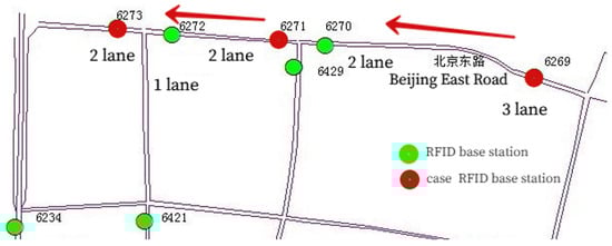 Three detection devices, 6269, 6271, and 6273, were selected as the analysis case data source, as shown as the red point in Figure 4, encompassing a total length of 660 m, where the traffic direction was shown as the red arrow. Each detection device can collect driving data from three lanes in the same direction, including basic data such as driving speed, vehicle lane, license plate, and passing time.