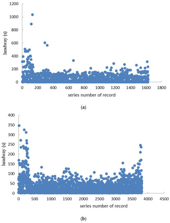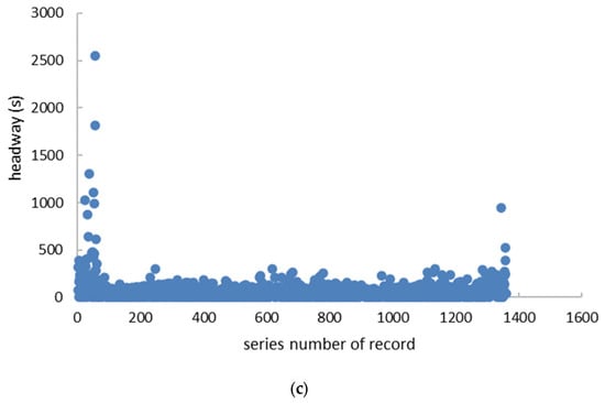 Regarding the distribution characteristics of headway, some abnormal values are exhibited in each lane; these values appeared during the early morning hours when vehicle movement was relatively low. The large headway between vehicles passing through the section is consistent with the actual conditions. For other periods, the headway is mainly distributed within 200 s. Due to the influence of the signal intersection cycle time, the generated headway time series also exhibits obvious periodic variation characteristics. However, due to the traffic density changes and the impact of vehicles arriving at adjacent intersections, the headway of vehicles passing through each cycle also exhibits complex variation patterns.