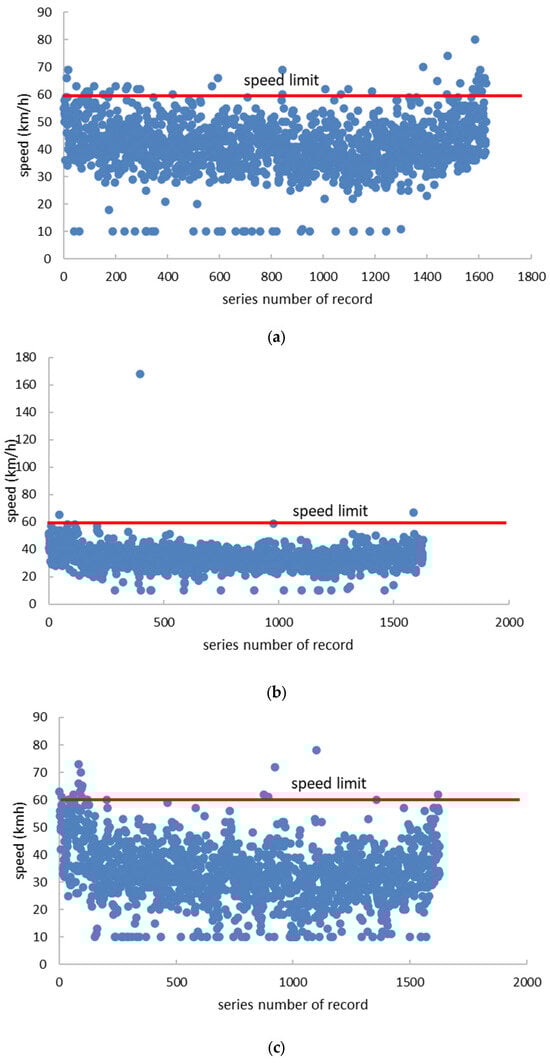 In this section, we show the vehicle speed distribution in the three detection sections, with the vehicles entering from lane 1 as the main analysis object. The speed of these vehicles passing through the downstream two sections was identified, and the distribution of vehicle speed scatter points was plotted as shown in Figure 6, where the y axis is the speed and the x axis is the speed series number of records; the speed limit is 60 km/h shown as the red line in Figure 6.